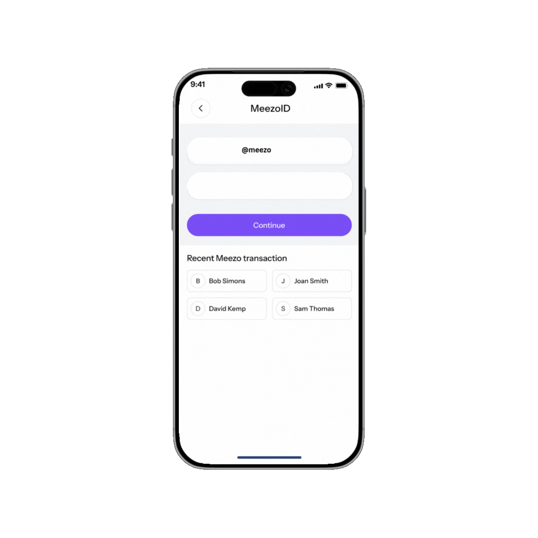 Pay using your unique Meezo ID — no need to share your phone number or bank details.